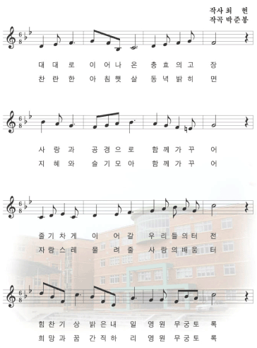 - 녹색은 대나무, 3개의 노란 다이아 - 본드는 학생·학부모·교사의 삼위일체를 뜻함